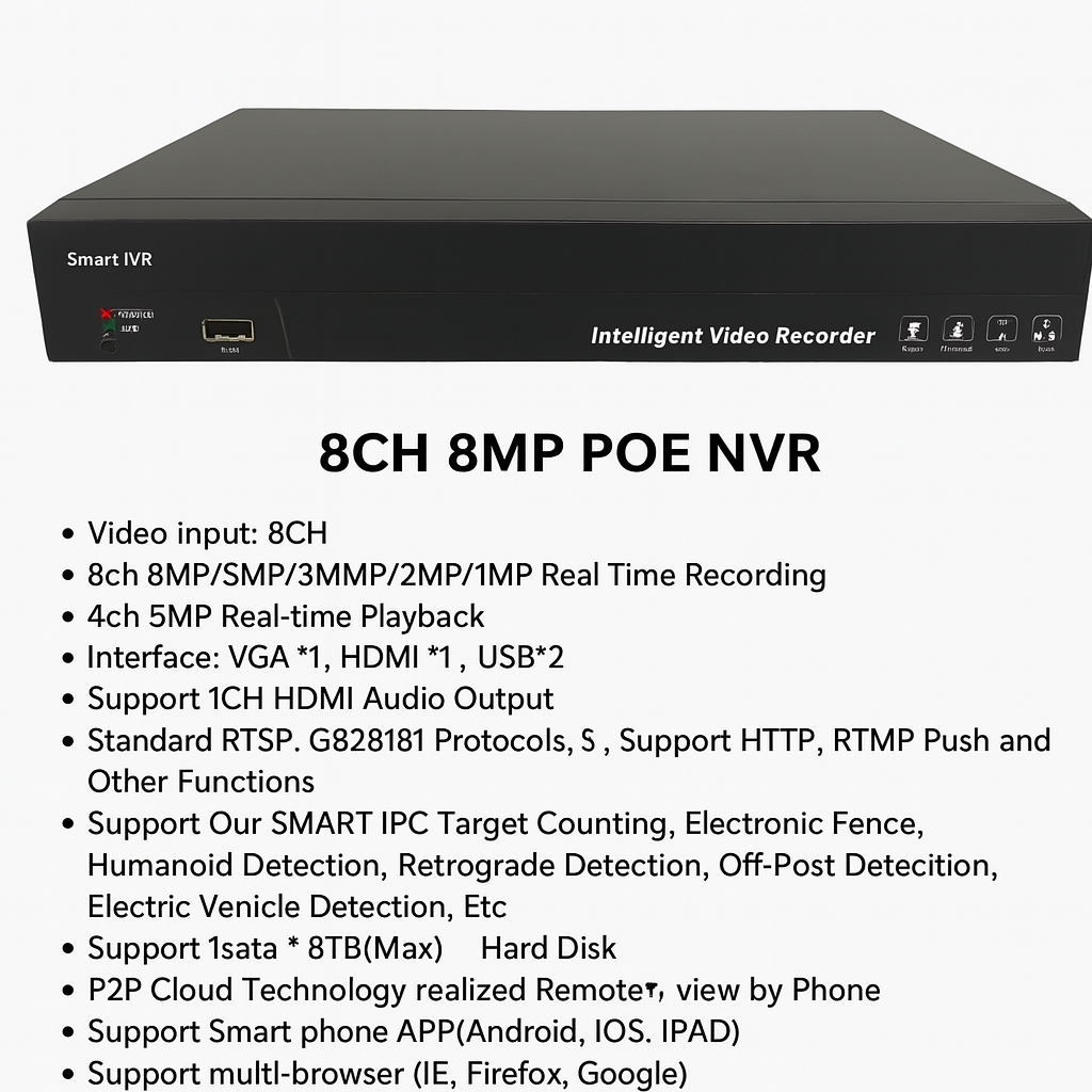 Upgrade your surveillance with the Fresh USA 8CH 8MP POE NVR Kit, a powerful and user-friendly plug-and-play video recording system. This advanced PoE (Power over Ethernet) NVR offers real-time 8MP recording across 8 channels and supports up to 4-channel 5MP playback for unmatched clarity and performance.